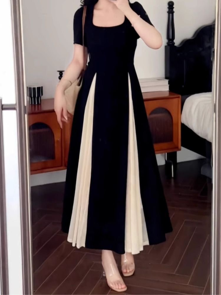 프렌치 스타일 허리 잡은 패치워크 원피스